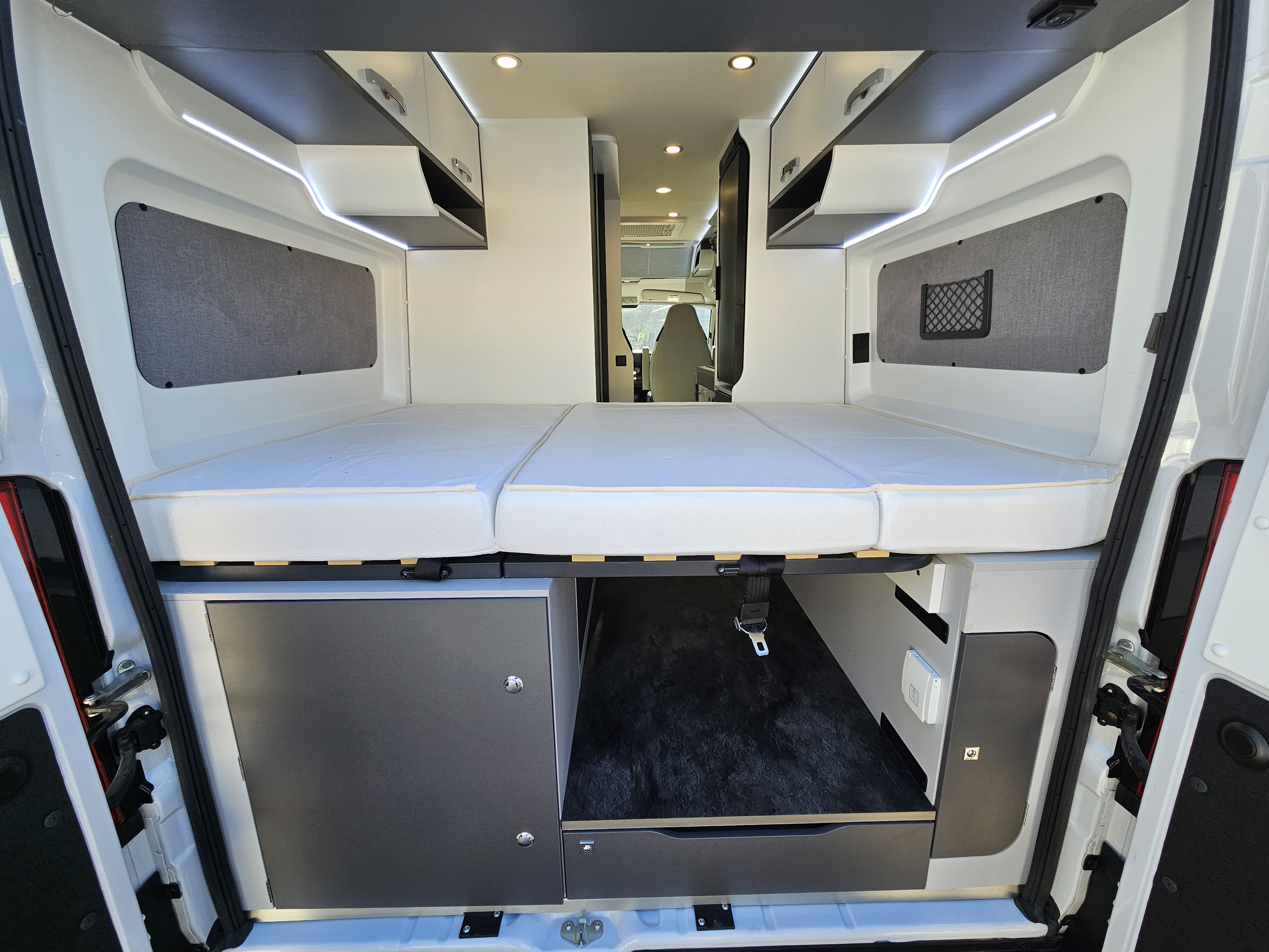 IMPLANTATION/ Lit transversal sur soute, maxi salon, salle d'eau sans rideau avec WC coulissant