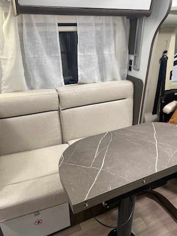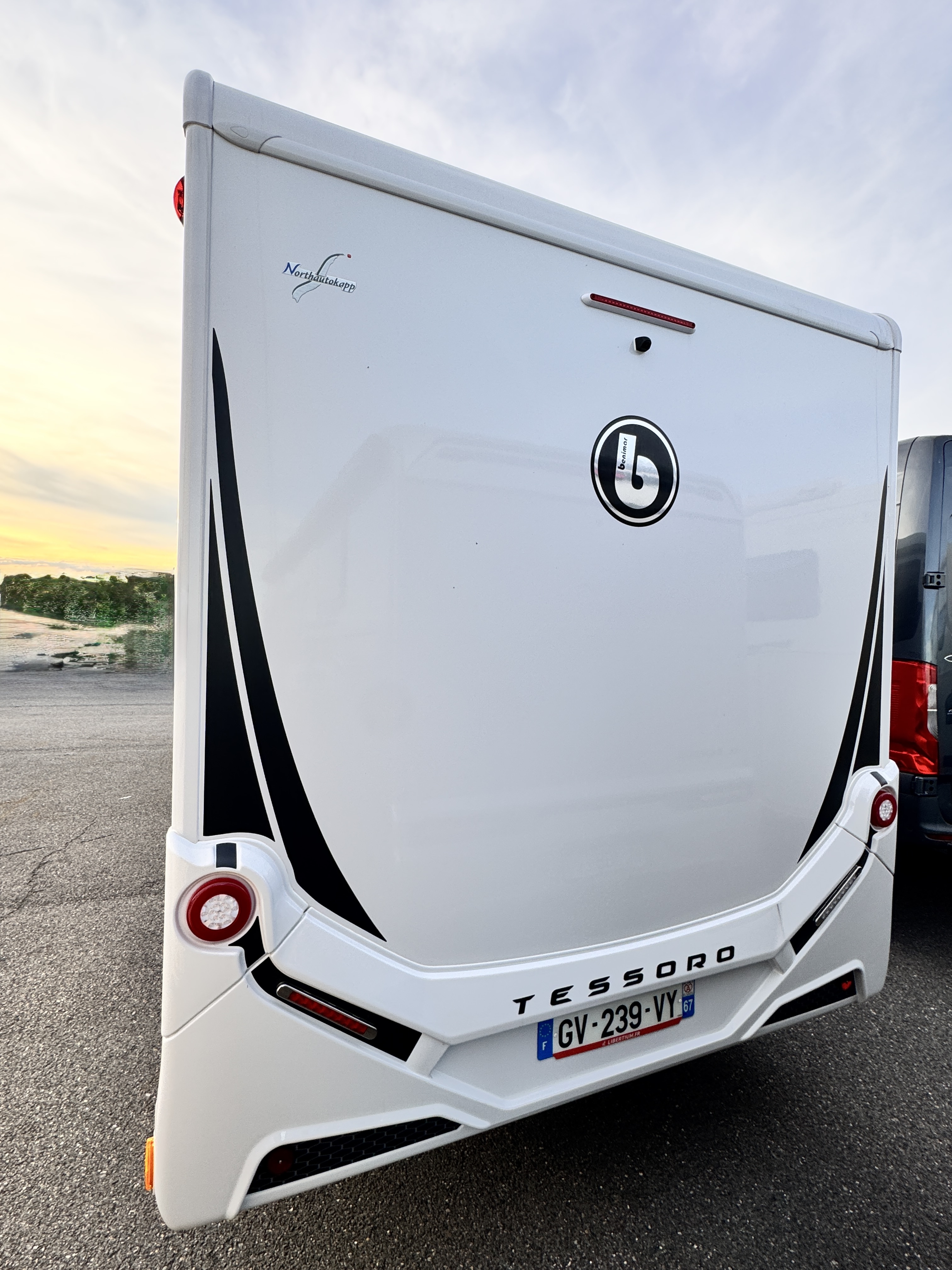 BENIMAR TESSORO 468 EDITION SPECIALE MODELE 2024 Porteur : Ford transit Motorisation : 2.0L 170 CV Boite : AUTOMATIQUE Long : 7.38M Larg. : 2.30M Hauteur : 2.89M PTAC : 3T500 Poids à vide : 3T059 4 Places carte grise / 4 Couchages EQUIPEMENTS CHASSIS : – ABS / ESP – Double airbag – Caméra de recul – Store d’occultation cabine type Remis – Fermeture centralisée cabine – Sièges confort réglables en hauteur/ pivotants/ double accoudoirs – Réglage des lombaires – Housses de sièges cabine ambiance cellule – Rétroviseurs électriques et dégivrants – Régulateur / limiteur de vitesse – Lèves vitres électriques – Commandes au volant – Volant cuir – Climatisation cabine manuelle – Store EXTÉRIEUR THULE AVEC ÉCLAIRAGE LED – Contrôleur de batterie BMV-712 Smart Bluetooth EDITION SPECIALE : *Motorisation 170CV *Boîte automatique *Radio tactile avec écran 9’’ XZENT *Pack DELIVERY *Pack WINTER *Jantes aluminium 16’’ *Cabine gris métallisé *Décoration extérieure spécifique *Signature Northautokapp EQUIPEMENTS CELLULE : – Structure entièrement fibrée / collée / et sans bois – Capacité eau propre : 105L – Capacité eaux usées : 105L – Réservoir eaux usées isolé et chauffé – Capacité coffre à gaz : 2 x 13Kg – Crash Sensor – Chauffage Truma Combi 6 EH gaz + électrique – Réfrigérateur 140L AES avec tiroir réfrigéré + Freezer – Eclairage LED – Eclairage extérieur – Lit pavillon électrique – Tissus : MEMPHIS Pack DELIVERY : * Panneau solaire 140W * Caméra de recul * Eclairage extérieur * Store d’occultation cabine type REMIS – Pack WINTER : * Réservoir des eaux usées isolé et chauffé * Marchepied isolé * Pré-installation 2ème batterie * Puissance de chauffage augmentée * Tuyaux de chauffage isolés * Couverture isotherme amovible pour vitres cabine DIMENSIONS SOUTE : Côté droit : 84 x 104 cm Côté gauche : 84 x 104 cm Hauteur max : 113 cm COUCHAGES : Lit pavillon électrique : 140 x 191 cm Lits jumeaux : 2 x (85 x 190 cm