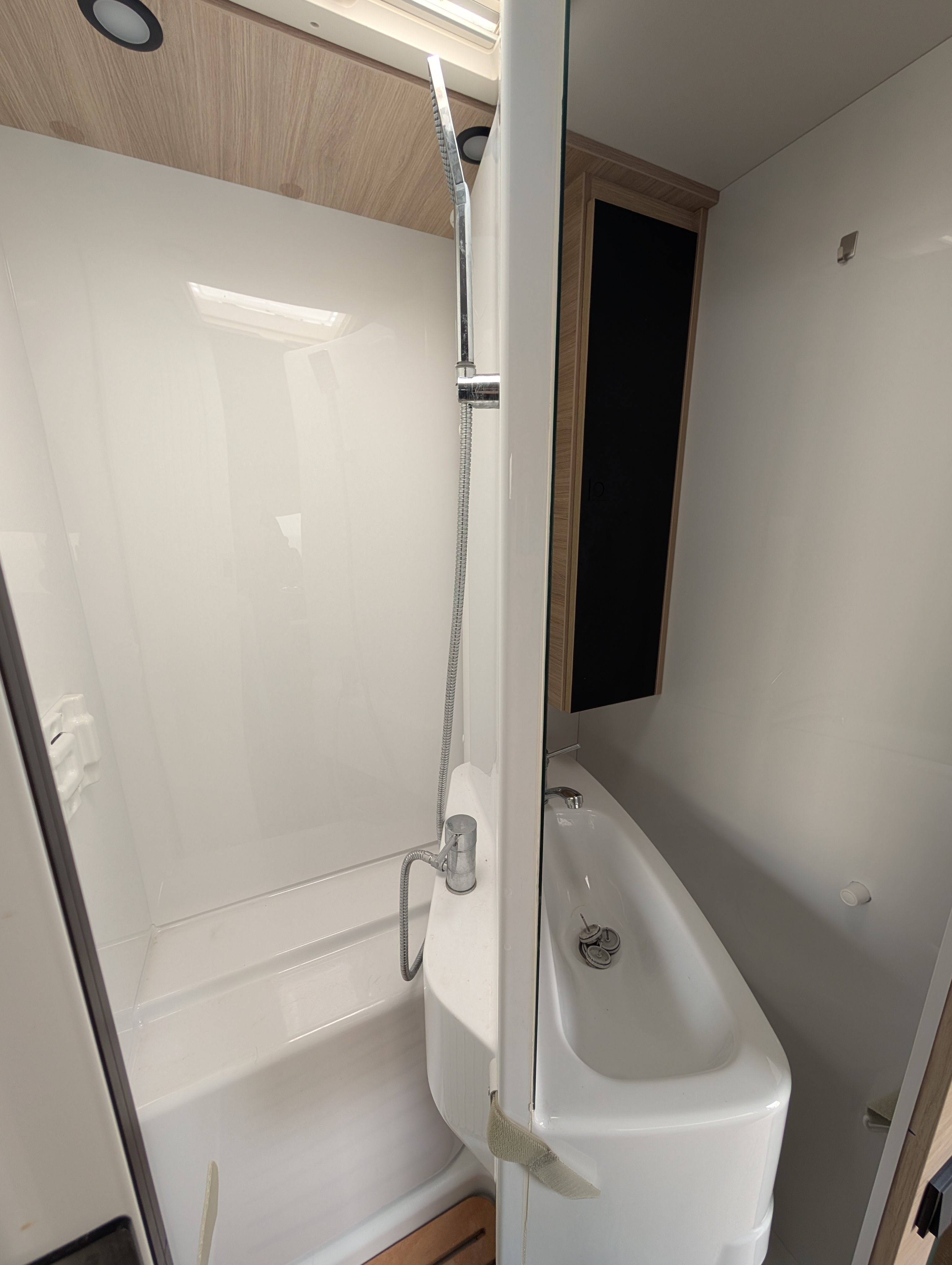 Enfin vous bénéficierez également des équipements supplémentaires installés à l’achat par le concessionnaire : gaz GPL, turbo vent sur lanterneau arrière pour extraire ou ventiler, système SOG sur cassette WC. Et de deux batteries cellule AGM de 100Ah chacune.
