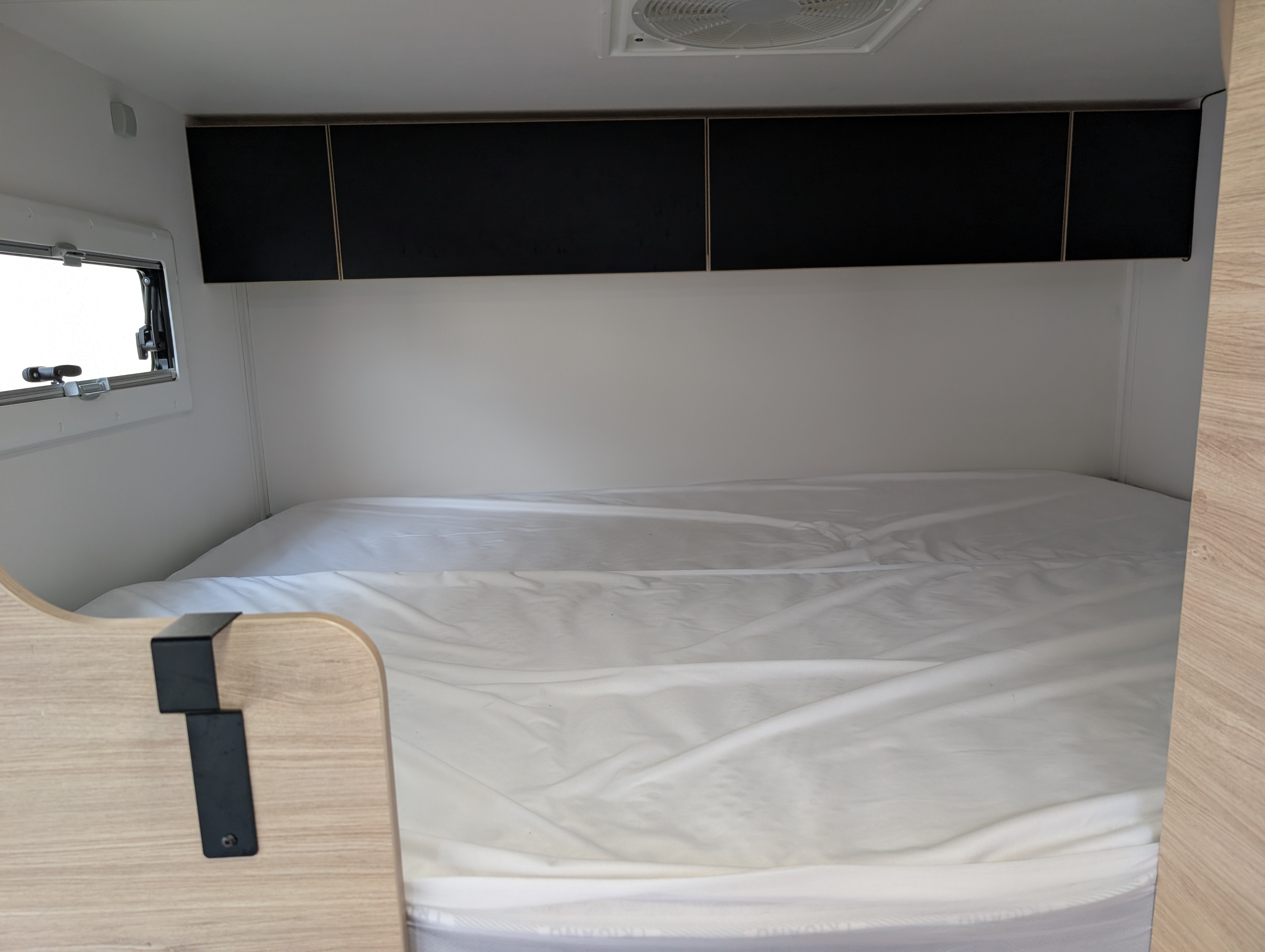 Une penderie et des rangements conséquents sont présents sous le sommier du lit avant, relevable pour faciliter l’accès. La soute est accessible de l’intérieur par une porte coulissante.