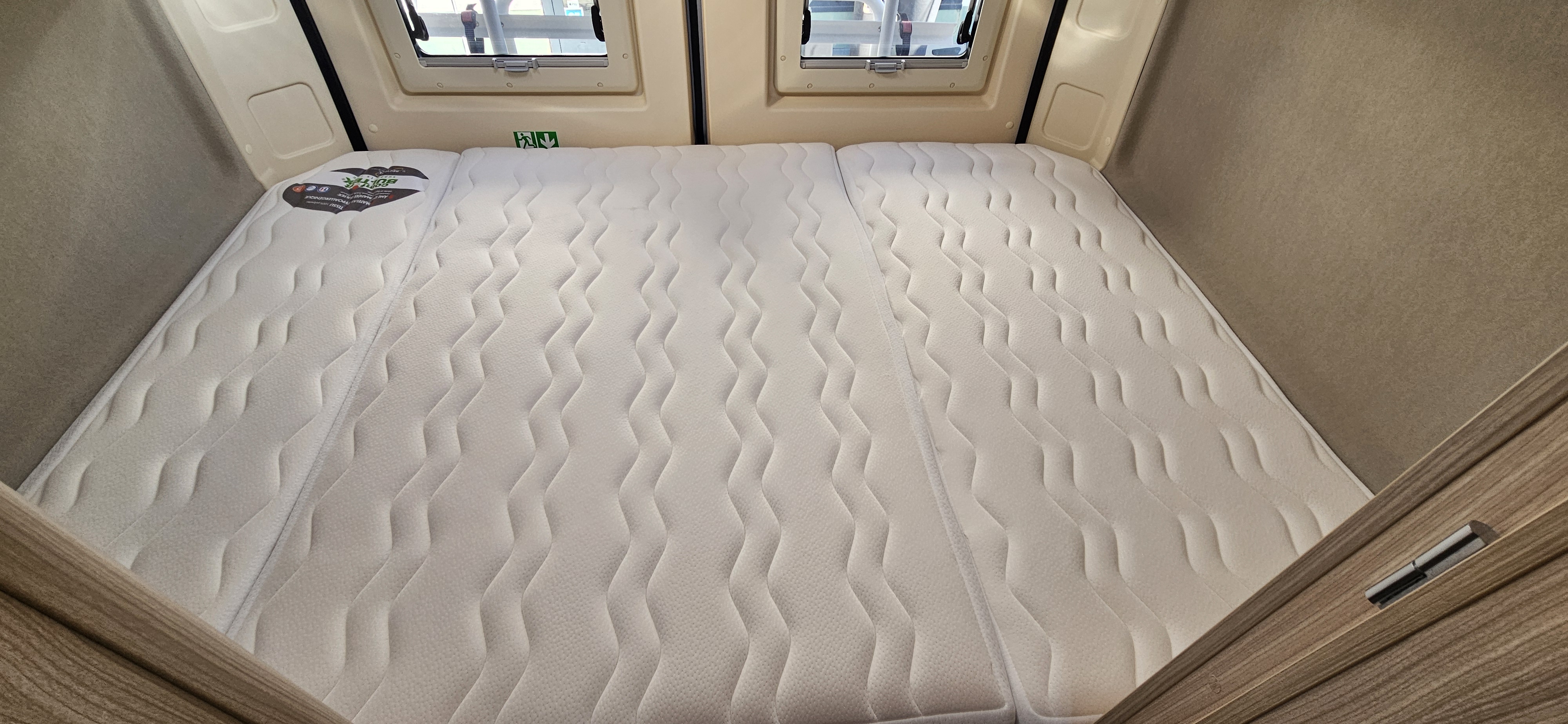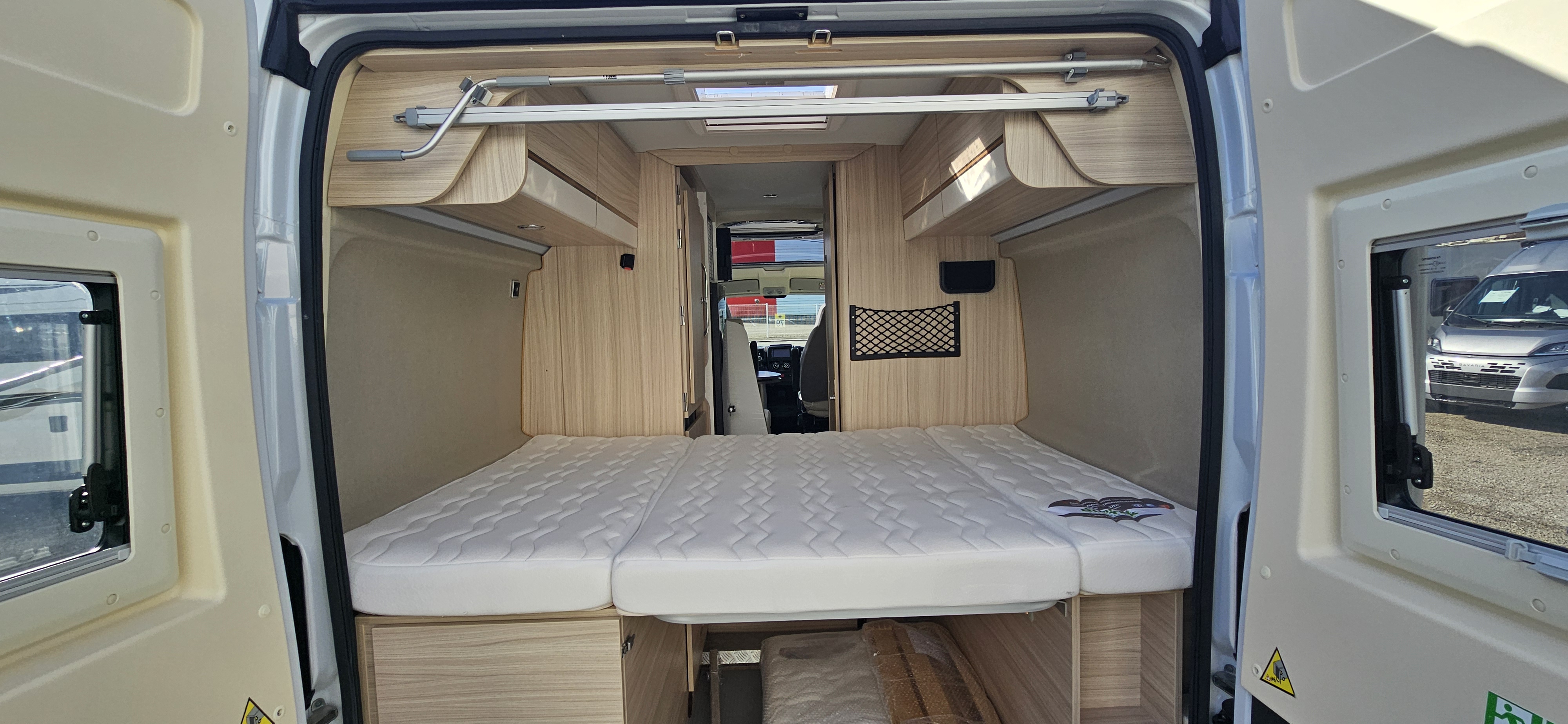 IMPLANTATION/ Lit sur soute (192x132), banquette face route avec sièges avants pivotants, douche et wc séparés