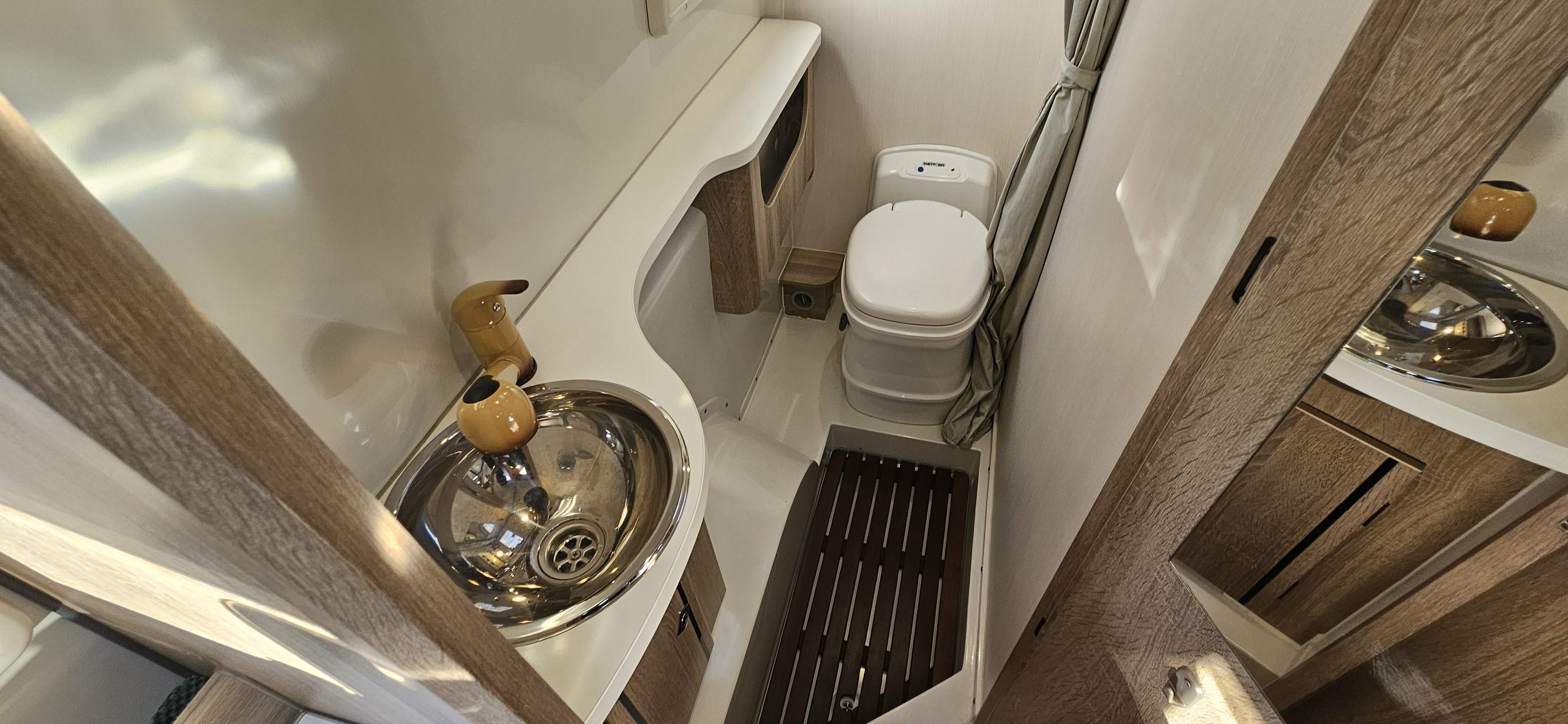 IMPLANTATION/ Lit à la Française (192x124), maxi salon avec banquette face route, douche/wc, couchage dinette(188x121)